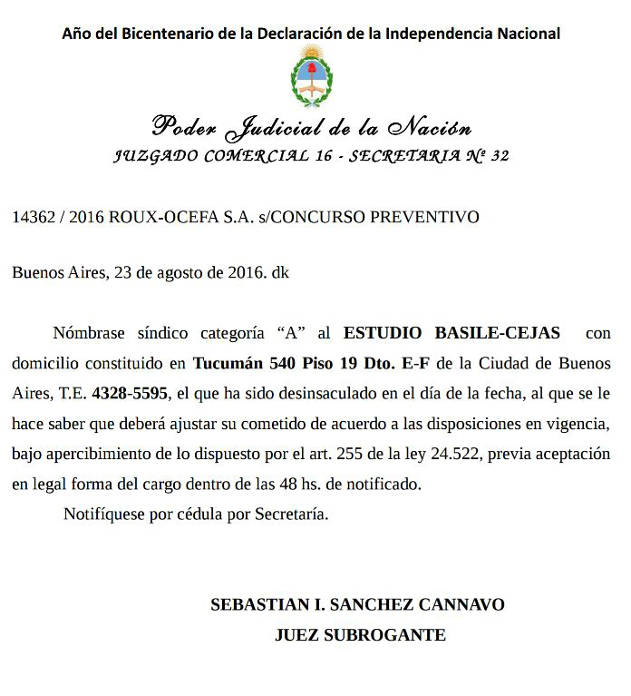 La convocatoria del laboratorio nacional Roux Ocefa ya tiene designado su síndico.
