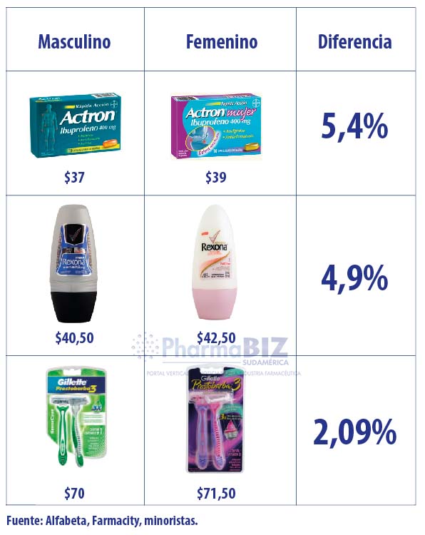Pharmabiz relevó la disparidad de precios en tres ítems: analgésicos, desodorantes y máquinas de afeitar. Por caso, una caja del analgésico Actron incrementa su precio en un 5.4% cuando se trata de la versión Actron Mujer. Un escenario similar ocurre con los desodorantes, que muestran una disparidad del 4.9%.