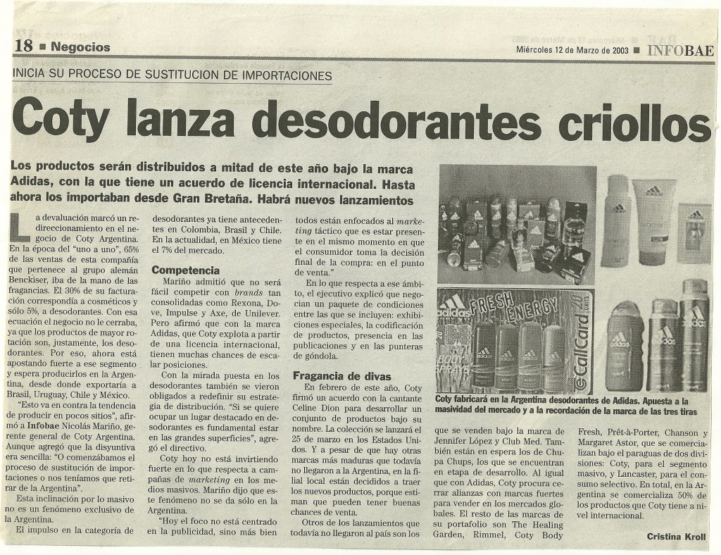 La devaluación marcó un redireccionamiento en el negocio de Coty Argentina. En la época del «uno a uno», 65% de las ventas de esta compañía que pertenece al grupo alemán Benckiser, iba de la mano de las fragancias. El 30% de su facturación correspondía a cosméticos y sólo 5%, a desodorantes. Con esa ecuación el negocio no le cerraba, ya que los productos de mayor rotación son, justamente, los desodorantes. Por eso, ahora esta apostando fuerte a ese segmento y espera producirlos en la Argentina, desde donde exportaría a Brasil, Uruguay, Chile y México.