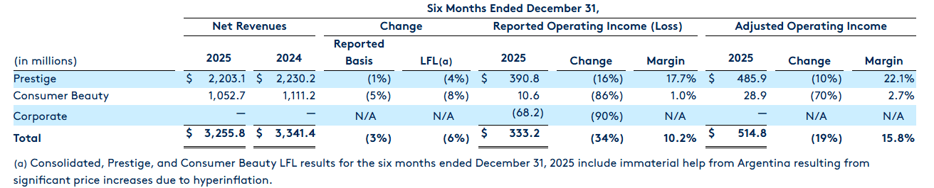 Los dos negocios de la norteamericana Coty terminaron el primer semestre del año fiscal 2026 a la baja. Así lo detalló en su reporte financiero publicado hoy, jueves 5 de febrero. Ver press release