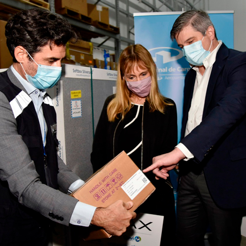 La secretaria de Acceso a la Salud, Sandra Tirado y el subsecretario de Estrategias Sanitarias, Juan Manuel Castelli, supervisaron la descarga de las dosis que arribaron al Aeropuerto Internacional de Ezeiza a través de la aerolínea KLM.