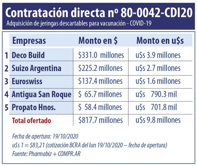 El cronograma de compras públicas sumó una contratación directa destinada a la compra de jeringas y agujas descartables para vacunación. La misma se puso en marcha bajo el rótulo «por emergencia sanitaria COVID-19» y tiene a cinco empresas oferentes.