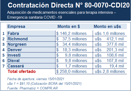 De acuerdo al análisis realizado por Pharmabiz, se presentaron a la compulsa un conjunto de siete empresas, las que elevaron una oferta total de $258 millones (u$s 2.8 millones). El principal oferente es el laboratorio nacional Fabra -propiedad de la familia homónima- que participa con su miorrelajante Atracurium; con su anestésico general a base de fentanilo; y con su bloqueante neuromuscular de bromuro de pancuronio. Todo por $146.2 millones (u$s 1.6 millones). Ver cuadro comparativo