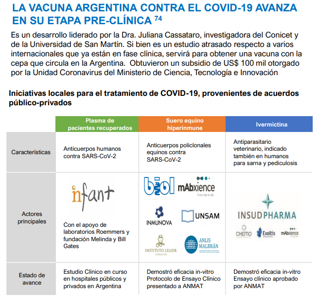 El suero equino hiperinmune, detalla el informe, ya demostró su eficacia in-vitro y se presentó a la ANMAT su pertinente protocolo de ensayo clínico. Forma parte de la investigación en la que colaboran el Instituto Biológico Argentino, el Malbrán, el Leloir, la UNSAM y las compañías Inmunova y mAbxience, el laboratorio de biosimilares del Grupo Insud, encabezado por Hugo Sigman.