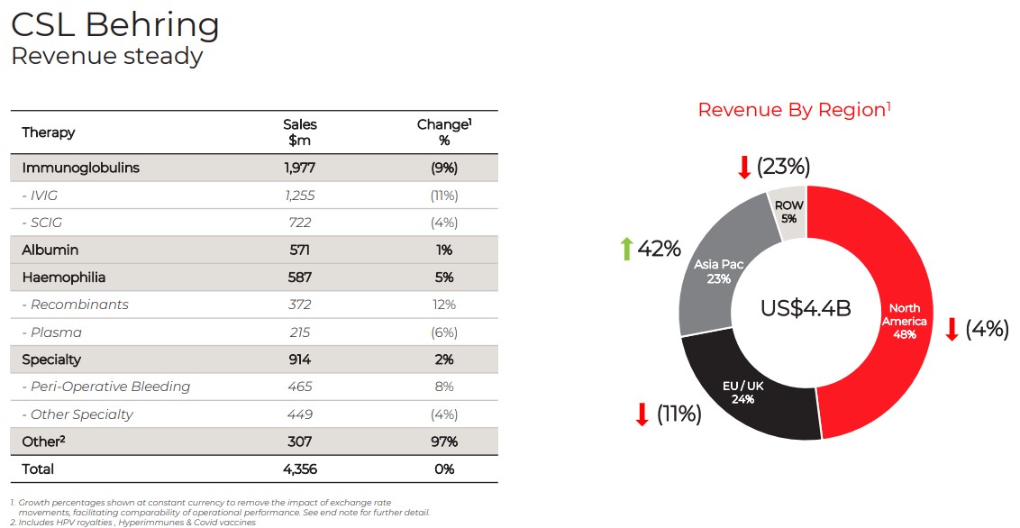 Mientras tanto, el negocio bautizado CSL Behring le devolvió al grupo alrededor del 72% de las ventas totales. Sin embargo, dicha división se mantuvo empatada con respecto al mismo período del año anterior, al facturar u$s 4.3 mil millones. Allí se destacó el crecimiento de su portafolio de Hemofilia que ascendió un 5% apalancado por el producto Idelvion que trepó un 17%. En contrapartida, su cartera de Inmunoglobulinas declinó un -9% y debido a que se vio afectada temporalmente por una escasez de oferta.