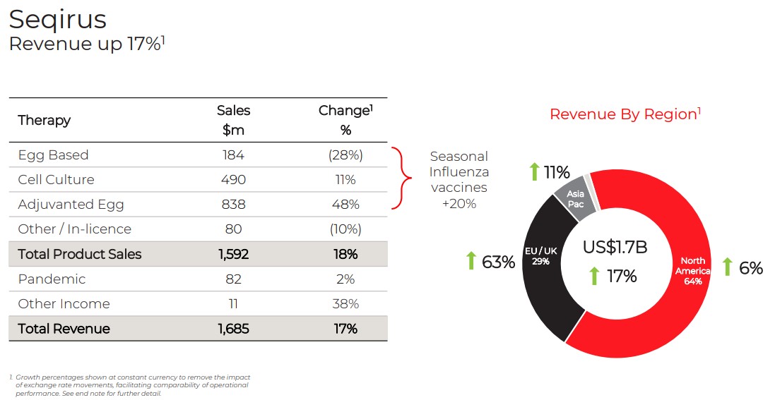 Al poner la lupa en cada segmento, su brazo Seqirus -que engloba a las vacunas contra la influenza– fue el que más se elevó con una suba del 17%. El mismo estuvo impulsado por un record en el volumen de dosis vendidas en el hemisferio norte, por la temporada alta de gripe.