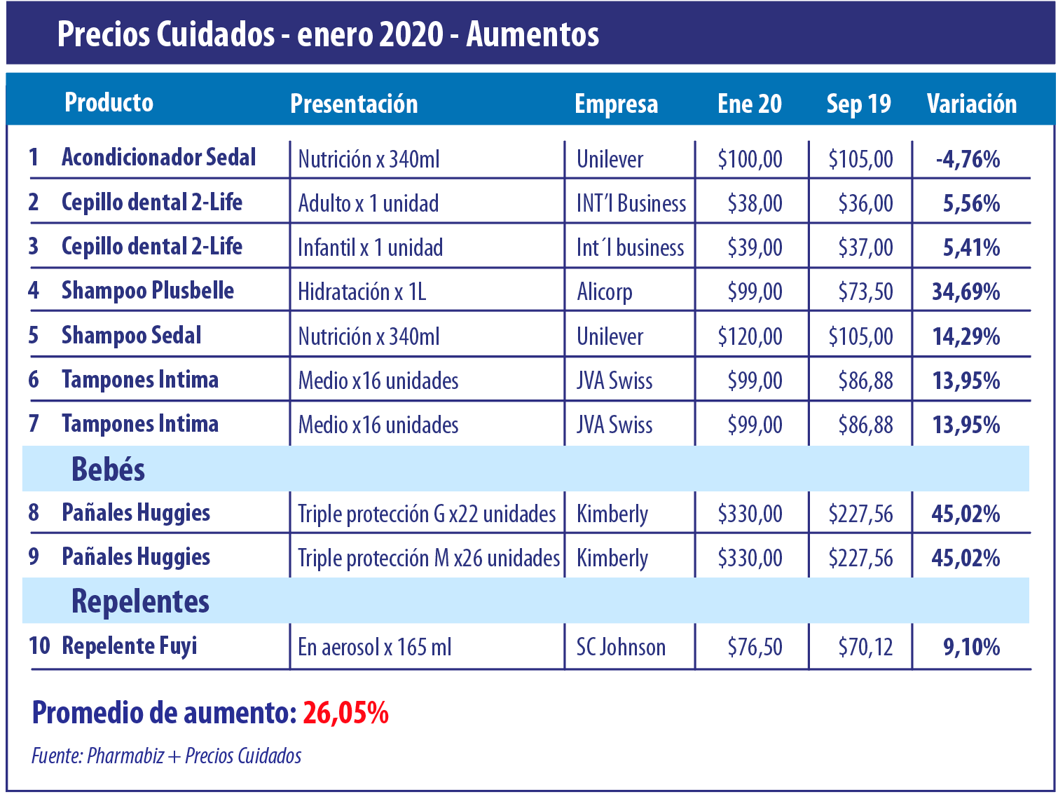 Aunque en este sexto año el listado tomó una nueva impronta reconfigurándose en varios aspectos. De acuerdo al desglose realizado por el equipo de analistas de Pharmabiz, se identificó que la categoría de Bebés se reforzó principalmente con pañales. Volvió a subirse a la nómina la norteamericana P&G con su línea Pampers; y la firma Softys -ex Papelera del Plata- con la etiqueta Babysec. Mientras que la norteamericana Kimberly-Clark mantuvo su presencia con Huggies, marca que desde la versión de septiembre se retocó un 45% en el marco de una inflación oficial estimada en 55% para todo el curso del 2019. Ver listado Precios Cuidados