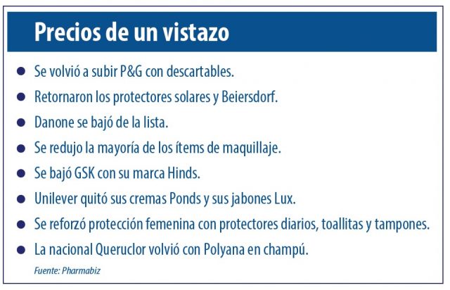 En tanto, los protectores solares volvieron a subirse a «los Cuidados». La única marca que figura es Nivea, de la alemana Beiersdorf con las variantes de 15 y 30 FPS. La multi además se sumó con Nivea al grupo de los desodorantes, en donde compite con Rexona y Axe, de la anglo-holandesa Unilever.