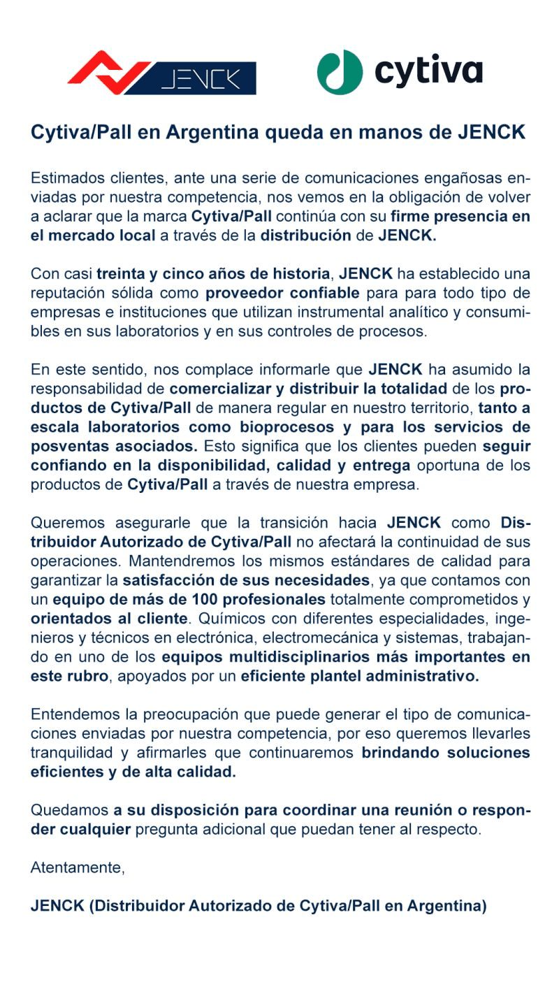 Mediante esta iniciativa, tomada por el regional de Cytiva, el bioquímico argentino, Patricio Baro, la empresa local fundada por Jorge Grinstein y Enrique Salvo que en el pasado ya era representante de Cytiva Pall para productos de laboratorio, ahora se convirtió en la responsable de la comercialización y distribución del negocio de bioprocesos. De modo que el grupo Danaher, propietario de Cytiva / Pall se apoya en Jenck, una firma que opera hace casi 35 años, como proveedor para empresas que requieren instrumental analítico y consumibles para controles de procesos y con base en el barrio porteño de Colegiales. Ver Linkedin