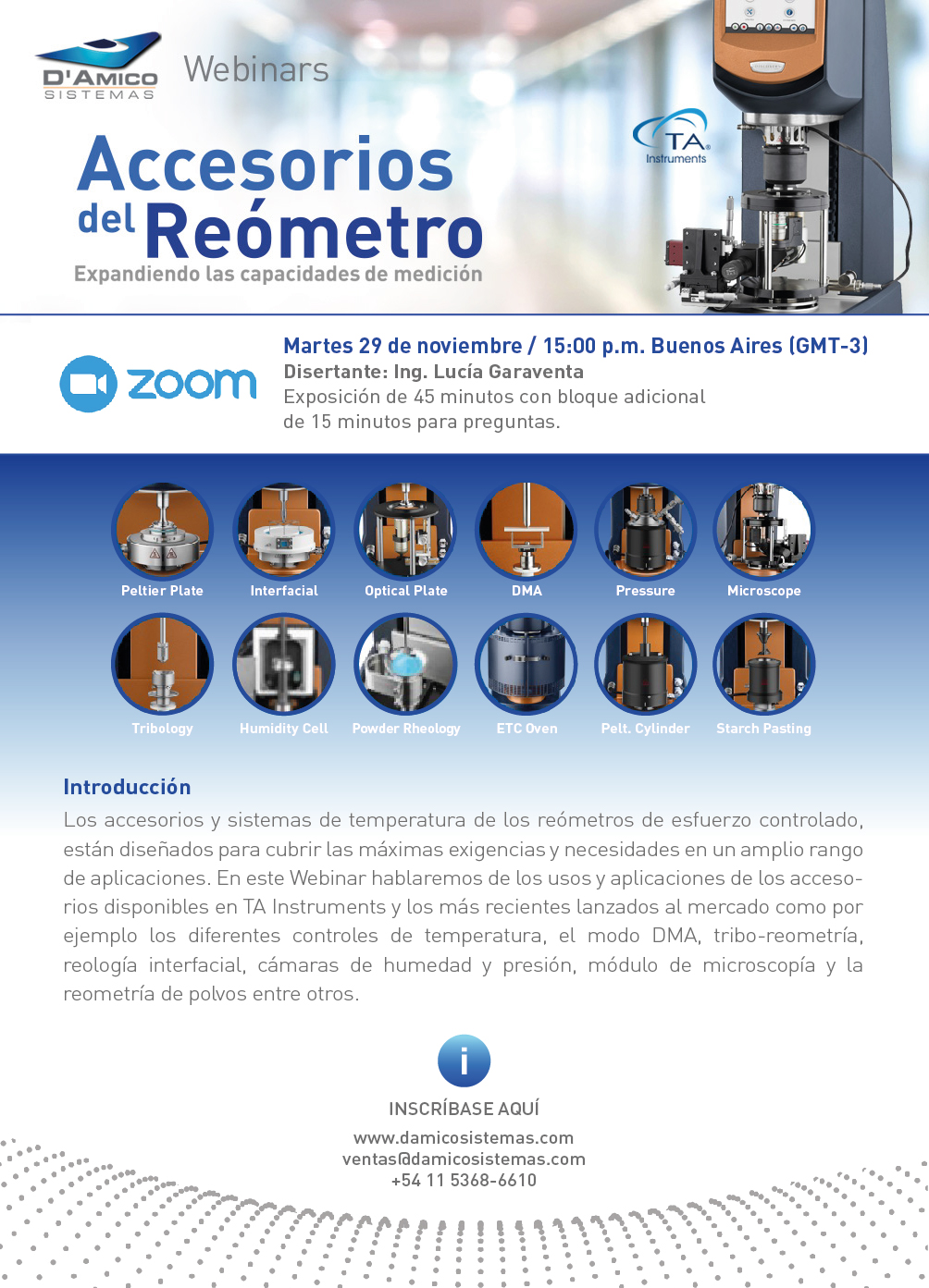 Las charlas virtuales siguen siendo súper relevantes en este 2022 post pandemia. D’Amico Sistemas, empresa representante de diferentes firmas referentes en instrumental analítico y sistemas integrales, brindará un webinar gratuito centrado en los accesorios del reómetro.