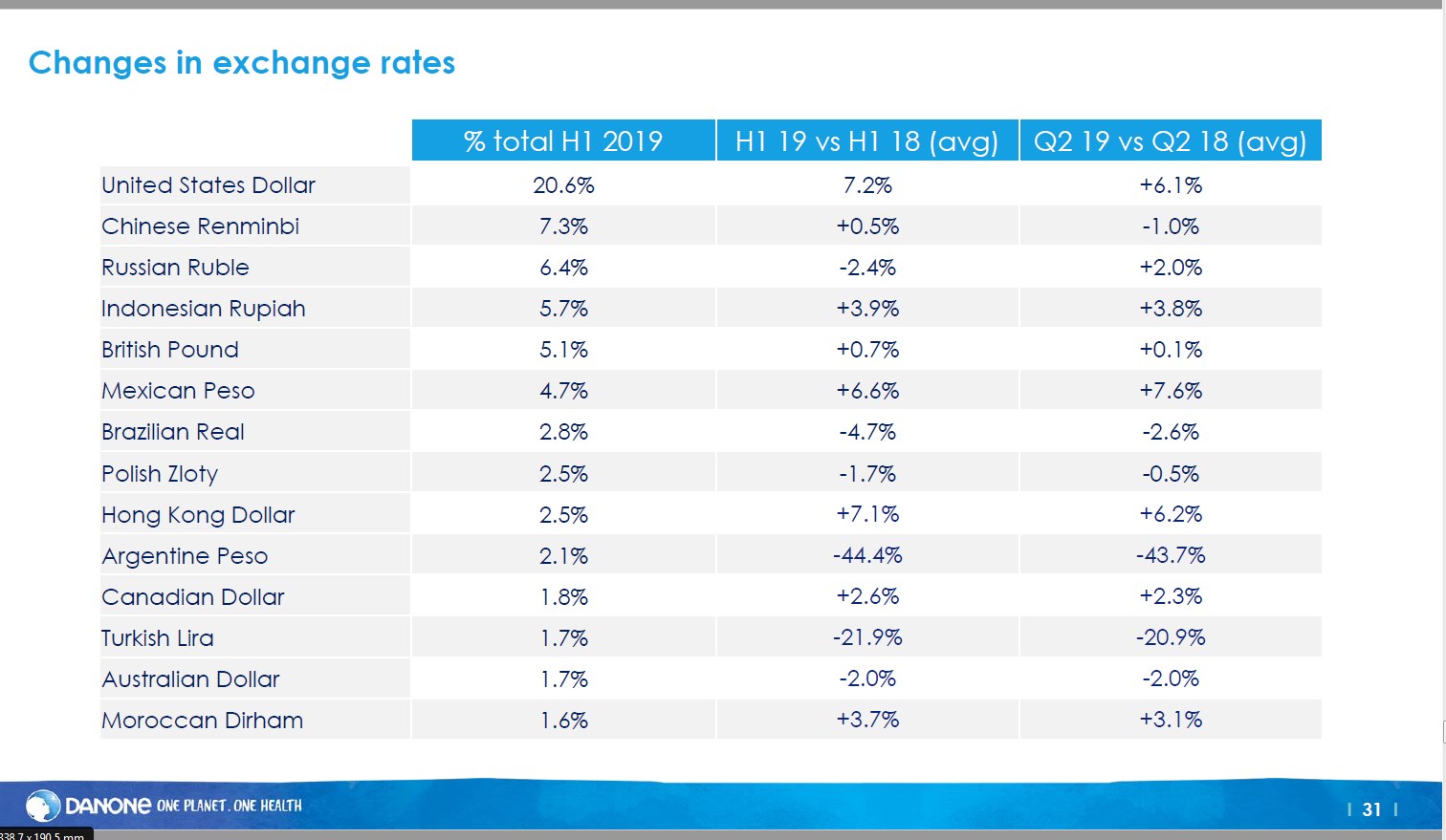 En su informe la compañía dedicó un apartado especial para listar el ratio de cambio de cada moneda y la Argentina tuvo una mención especial. La particularidad de contar con un mercado hiperinflacionario y un consumo recesivo impactó sobre la propia Danone que desde el 1 de julio del año pasado está aplicando el IAS 29 según las normas internacionales de información financiera -IFRS-. Ver cuadro abajo.