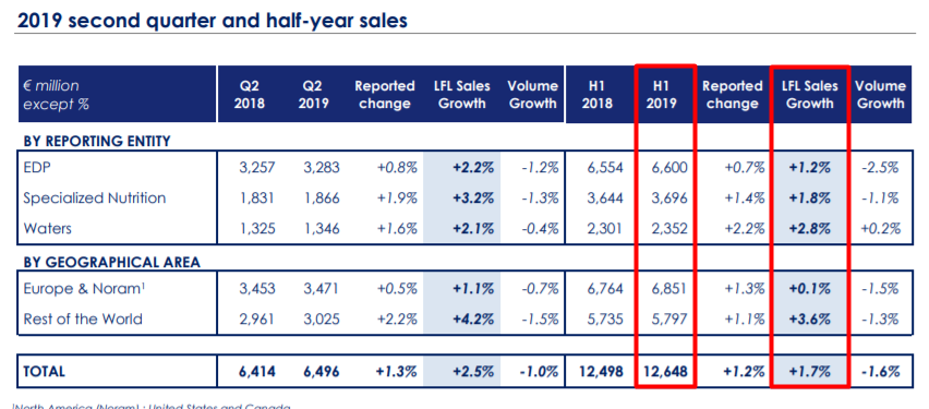 La gigante de consumo masivo Danone abrió sus números del semestre. En esta primera mitad del año la multi francesa dijo que avanzó un 1.7% en sus ventas globales en comparación con el mismo período del 2018, y que facturó € 12.6 millones. Ver press release.