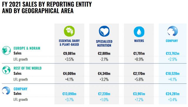 Por debajo quedó el negocio de Productos Lácteos Esenciales y de Origen Vegetal -EDP-. El mismo facturó € 13.090 millones, la cifra más alta para la compañía, lo que significó un alza del 3.7%. Donde más creció la cartera de EDP fue en «Resto del Mundo», donde aumentó un 4.1% con ventas por € 4.009 millones. Por último en Europa y Norteamérica subió un 3.5% a € 9.081 millones.