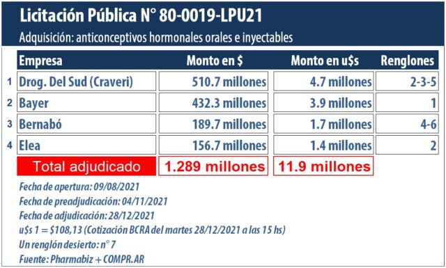 A dos días de que se dé por clausurado el año se definió una licitación de anticonceptivos para la cual se destinarán $1.289 millones (u$s 11.9 millones). El gran ganador fue Droguería del Sud, que captó cerca del 40% del monto total. Otros adjudicatarios fueron la alemana Bayer, y los nacionales Elea y Bernabó.