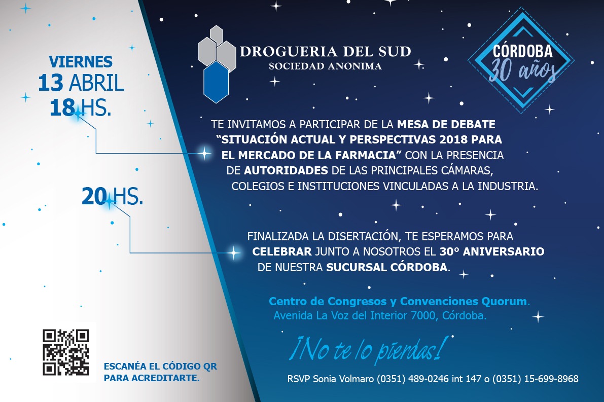 Hoy viernes 13 de abril Droguería del Sud organizó una mesa redonda en Córdoba con destacados oradores, a fin de celebrar las tres décadas de la sucursal mediterránea.