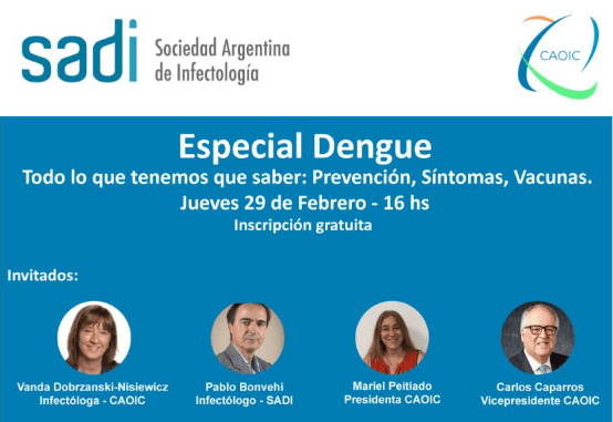 El dengue está en el centro de la escena en casi todo el país. En ese marco, hoy, jueves 29 de febrero, la CAOIC realizará un webinar junto a la Sociedad Argentina de Infectología (SADI). Allí se profundizará en todo lo que hay que saber sobre esta enfermedad, desde la prevención, los síntomas y las vacunas disponibles.