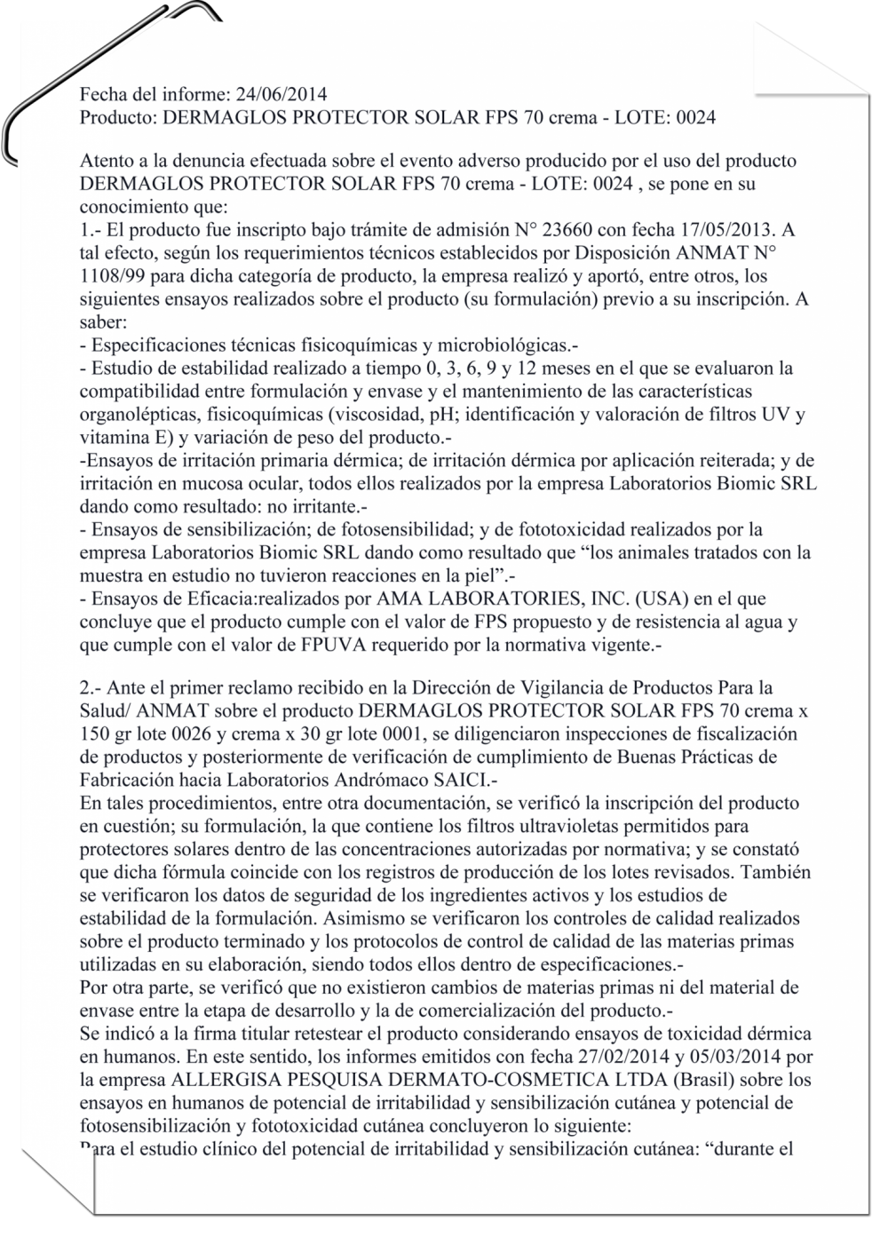 La ANMAT todavía no tiene listas las conclusiones finales acerca del sumario abierto al laboratorio Andrómaco por el caso de Dermaglós Protector Solar 70, que salió a la luz en enero pasado. Ver artículo.