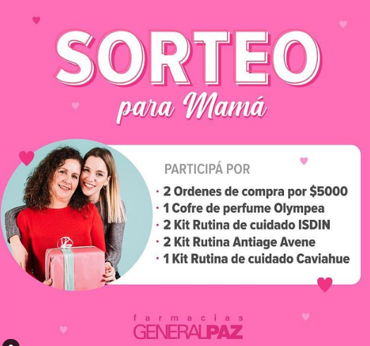 En Córdoba, General Paz propuso como premios dos órdenes de compra por $5000 (u$s 47,78); un cofre de perfume Olympea, de Paco Rabanne, de la española Puig; y distintos kits de dermocosmética de las etiquetas ISDIN, Avène y Caviahue. Además, la cadena en manos de Walter Pernochi invita a sus seguidores a acceder a la tienda online, donde se encuentran descuentos en artículos seleccionados. Ver Instagram General Paz.