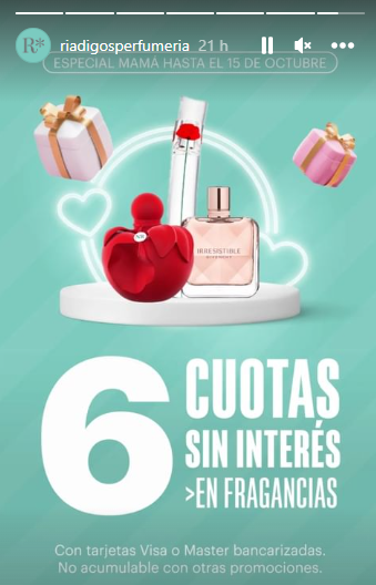Por su parte, Farmacias RP puso la lupa en las fragancias, un regalo clásico para esta fecha. En sus redes sociales el retailer de Eduardo Dosisto publicó una serie de perfumes con un descuento de entre el 10 y el 20%. Además, ofreció cuotas sin interés, en un escenario en el que los precios de las fragancias importadas se disparó. Asimismo, también cuenta con la posibilidad de recibirlo a domicilio, gratis, en todo el país. Ver Farmacias RP