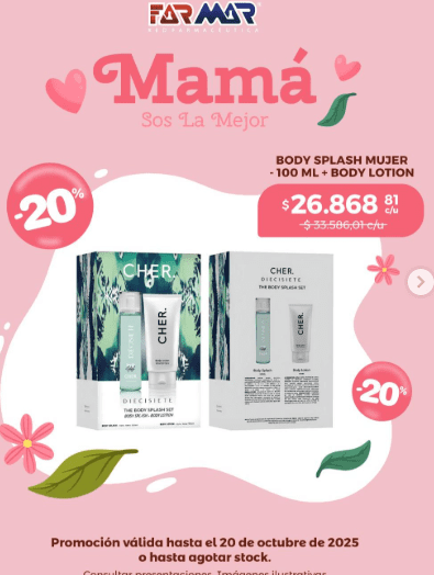 En la vereda de enfrente, Farmar, de Juan Castro y con presencia en Corrientes y provincias del NOA y el NEA, publicó «Mamá, sos la mejor». Y con esos posteos también comunicó los descuentos y los precios de los kits ideales para regalar, con perfumes, y body splash, entre otros. Ver Farmar