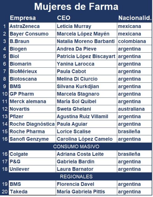 En ese marco, estas ejecutivas se suman a otras mujeres que siguen al frente de multis y empresas nacionales. Entre ellas se puede mencionar a la australiana Sweta Ghelani, quien quedó al mando de la nueva Novartis unificada en la Argentina. Asimismo, la alemana Merck sigue bajo el timón de dos mujeres a nivel global y en la Argentina. Se trata de la española Belén Garijo López y la joven ejecutiva María Sol Quibel, respectivamente. En tanto, en la francesa Sanofi la número uno de Specialties continúa siendo Carolina López Camelo. Ver artículo unificación Novartis.