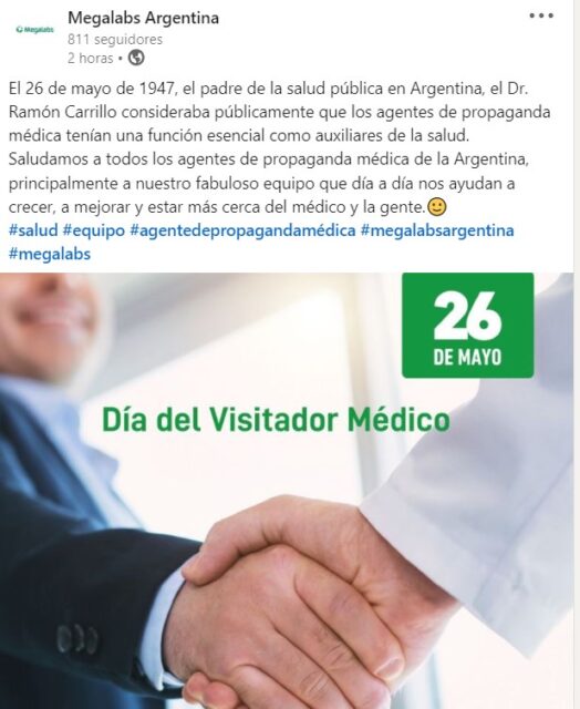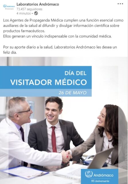 También hizo lo propio el laboratorio nacional Andrómaco, que le deseó un «feliz día» a su plantilla de AMPs y remarcó que éstos «generan un vínculo indispensable con la comunidad médica«. En tanto, el laboratorio Géminis brindó reconocimiento a su equipo de APMs. La firma que este mes eligió a Hernán Ferreiro para que estrene la posición de gerente general en la empresa propiedad de Carlos Eraldo, les agradeció «por su profesionalismo, dedicación y compromiso diario». Ver artículo Géminis