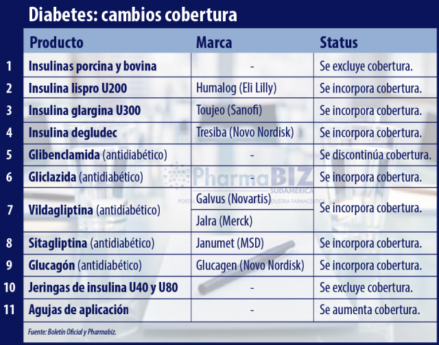 En definitiva, son varias las nuevas insulinas que formarán parte del PMO. Las mismas son: Humalog, de la norteamericana Eli Lilly; Toujeo, de la francesa Sanofi; y Tresiba, de la danesa Novo Nordisk. Lo mismo aplica para la categoría de antidiabéticos orales. Se incluyeron a Galvus, de la suiza Novartis; Jalra, de la alemana Merck; y Janumet, de la norteamericana MSD. Se enlistó además a Glucagen, de la danesa Novo Nordisk.