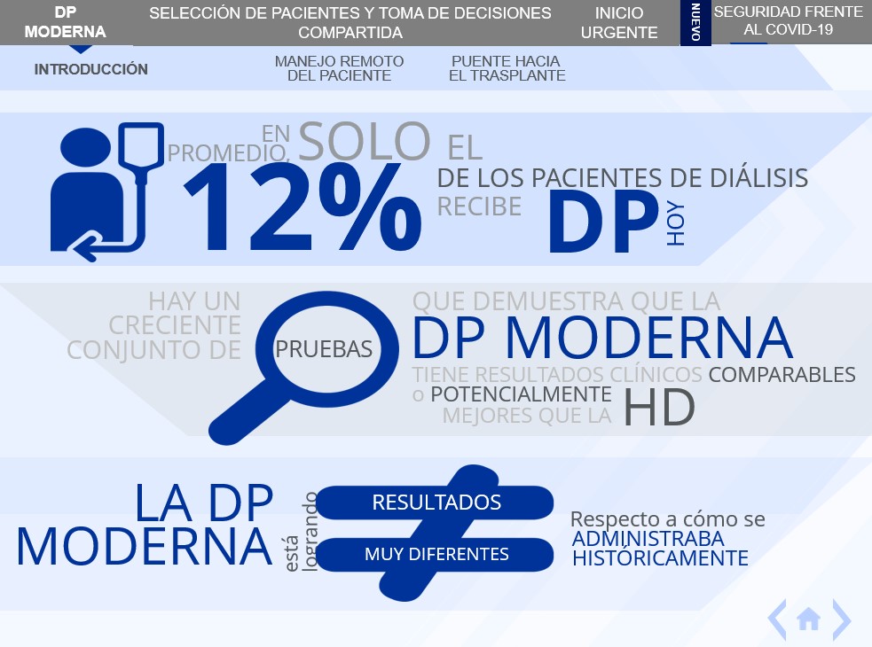 La diálisis peritoneal se constituye en una opción de gran valor para los pacientes que pueden recibir el mismo servicio en las instalaciones de su hogar. Sin embargo, esta práctica no termina de despegar fundamentalmente por la falta de conocimiento de esta alternativa. Esto a pesar de que el equipamiento adaptado para el uso hogareño requiere únicamente de una cicladora que tiene el tamaño y peso de una CPU. Además son necesarias paredes pintadas y sin humedad, pisos simples de limpiar y sin alfombras. Puertas y ventanas que se puedan cerrar para evitar corrientes de aire y un pie de suero o similar a efectos de colgar la bolsa.