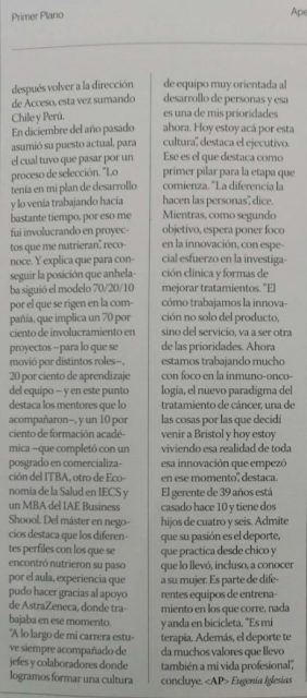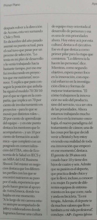 La nota, sin embargo, funciona casi como un epígrafe. La primera parte sólo describe el detalle de sus cargos, los que pueden conocerse con solo echar un vistazo a su cuenta de Linkedin; dice que está casado y que corre, nada y anda en bici. Y agrega que «espera poner foco en la innovación con especial esfuerzo en la investigación clínica», como si las multis de farma no estuvieran todas en la misma faena y como si eso no fuera una estrategia global que Diddi ni siquiera tiene el alcance de definir.