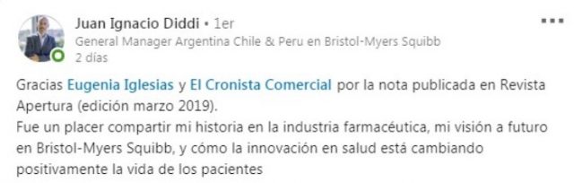 Al gerente general de BMS en la Argentina le gusta el autobombo. En estos días, Juan Diddi, que asumió dicha posición en diciembre pasado se está ocupando de autopromocionar su propia nota que salió publicada en una revista de economía y negocios.