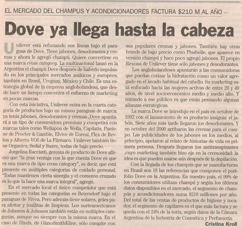 Unilever está reforzando sus líneas bajo el paraguas de Dove. Tiene jabones, desodorantes y cremas y ahora le agregó champú. Quiere convertirse en una marca cross category. La multinacional lanzó en la Argentina el champú Dove después de haberlo impulsado en los principales mercados asiáticos y europeos, también en Brasil, Uruguay, México y Chile. Es una estrategia global de la empresa angloholandesa, que desde hace un tiempo concentra el esfuerzo de marketing en pocas marcas. Con esta iniciativa, Unilever entra en la cuarta categoría de productos bajo un mismo paraguas de marca: ya tenía jabones, desodorantes y cremas. Dove apuntará a un tipo de consumidora premium y competirá con marcas tales como Wellapon de Wella, Capilatis, Pantene de Procter & Gamble, Elvive de L’oreal, Flex de Revlon y Alberto VO5 de La Fármaco. Unilever también tiene Organics, Sedal y Suave, todas de bajo precio. Jorgelina Racciatti, gerenta de producto de Dove afirmó que «la gran ventaja con la que cuenta Dove es que es una marca de tipo cross category«, es decir, que está presente en múltiples categorías de cuidado personal. Todas mantienen cierta sinergia y el consumo cruzado es lo que la hace una marca integral«, agregó. En el mercado local el único competidor que está presente en todas las categorías es Beiersdorf bajo el paraguas de Nivea. Pero además tiene solares, geles para afeitar y toallitas de limpieza. Los norteamericanos de Johnson & Johnson también están en múltiples categorías, aunque no siempre con la misma marca. En el caso de Hinds, de GlaxoSmithKline, sólo compite con sus populares cremas y jabones. También hay otras brands de bajo precio como Plusbelle, que aparece en versión champú y hace poco agregó jabones. El propio Rexona de Unilever tiene sólo jabones y desodorantes. Los angloholandeses apuntarán a las consumidoras que puedan cotizar la hidratación como un valor agregado en el lavado habitual del cabello. Su marketing está enfocado hacia las mujeres activas de entre 20 y 49 años, de nivel socioeconómico medio y medio alto. Y mirando a ese público es que están pensando algunas alianzas estratégicas. La marca Dove se introdujo en el país en octubre de 1992 con el lanzamiento de su producto insignia: el jabón. Siete años más tarde llegaron los desodorantes. Y en octubre del 2000 arribaron las cremas para el cuerpo. Las publicidades de los jabones en los medios, al principio, apelaron al relato de historias de vida en primera persona. Después llegaron los antitranspirantes, cuyo marketing también hizo eje en la cremosidad: la idea es que pueden usarse aún después de la depilación. Con la llegada de los champús que se manufacturan en Brasil son 18 las referencias que componen el portfolio Dove en la Argentina. En nuestro país, el 99% de los consumidores utilizan champú y según los últimos datos disponibles en el mercado, el segmento de champús y acondicionadores suma $210 millones por año. Del total de las ventas de productos de higiene y tocador, el segmento de capilares es el que más factura y se queda con el 24% de la torta, según datos de la Cámara Argentina de la Industria de Cosmética y Perfumería. Por Cristina Kroll