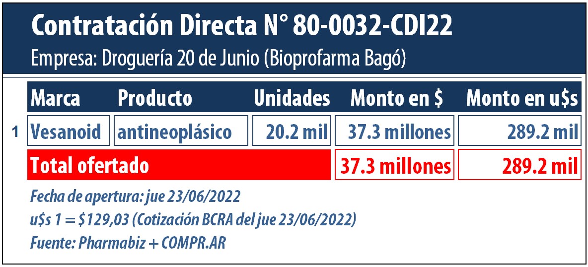 El proceso tiene como oferente a la Droguería 20 de Junio, propiedad de la familia Litmanovich. La empresa que tiene base en Rosario cotizó una suma de $37.3 millones (u$s 289.2 mil) equivalentes a 20.2 mil unidades de Vesanoid. La marca del laboratorio biotecnológico Bioprofarma Bagó está indicada para el tratamiento de la leucemia promielocítica aguda y es fabricada en Alemania por la norteamericana Catalent, experta en la elaboración de cápsulas blandas.