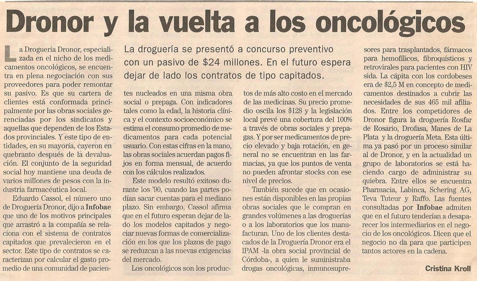 La Droguería Dronor, especializada en el nicho de los medicamentos oncológicos, se encuentra en plena negociación con sus proveedores para poder remontar su pasivo. Es que su cartera de clientes está conformada principalmente por las obras sociales gerenciadas por los sindicatos y aquellas que dependen de los Estados provinciales. Y este tipo de entidades, en su mayoría, cayeron en quebranto después de la devaluación. El conjunto de la seguridad social hoy mantiene una deuda de varios millones de pesos con la industria farmacéutica local.