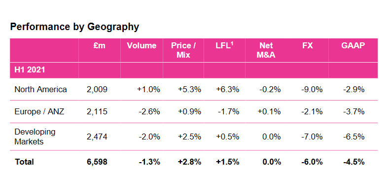 En tanto, los ingresos del segmento de Nutrición declinaron un -8,5% en comparación con el primer semestre del año anterior, al totalizar £ 1.427 millones (u$s 1.968,3 millones). En esta división la multi incluyó a nivel global a las fórmulas infantiles Enfamil, heredadas de Mead Johnson.