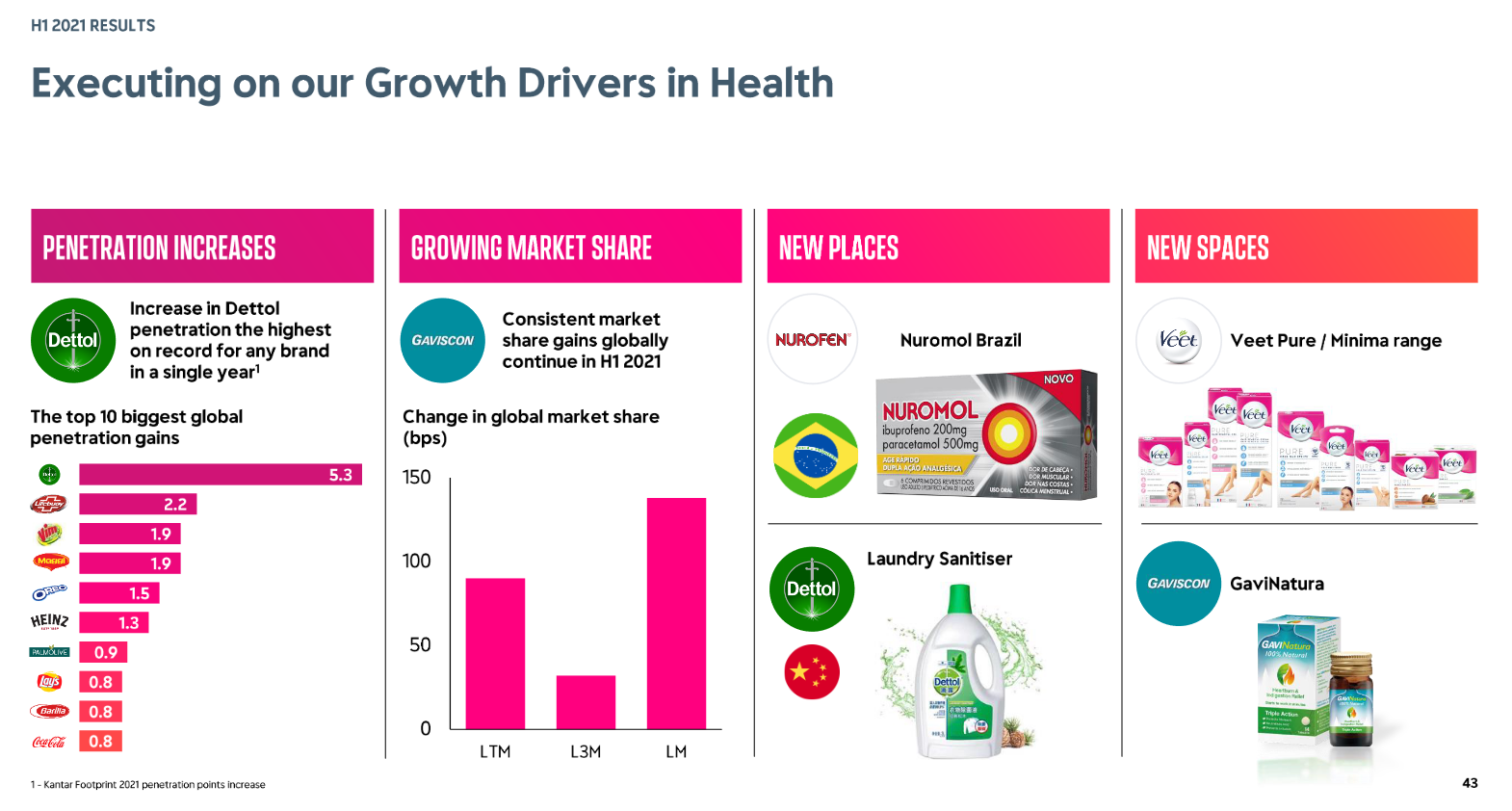 Por su parte, las ventas de la división Health cayeron un –10,2% a £ 2.144 millones (u$s 2.957,2 millones), pese al crecimiento que registraron los preservativos Durex y los geles KY, enrolados bajo el segmento de bienestar íntimo; así como la marca de depilación Veet y el antiácido Gaviscon. El descenso estuvo explicado por la mayor competencia que enfrentó el antiséptico Dettol -o Espadol, según los mercados-; y una temporada débil de resfriados y gripe.