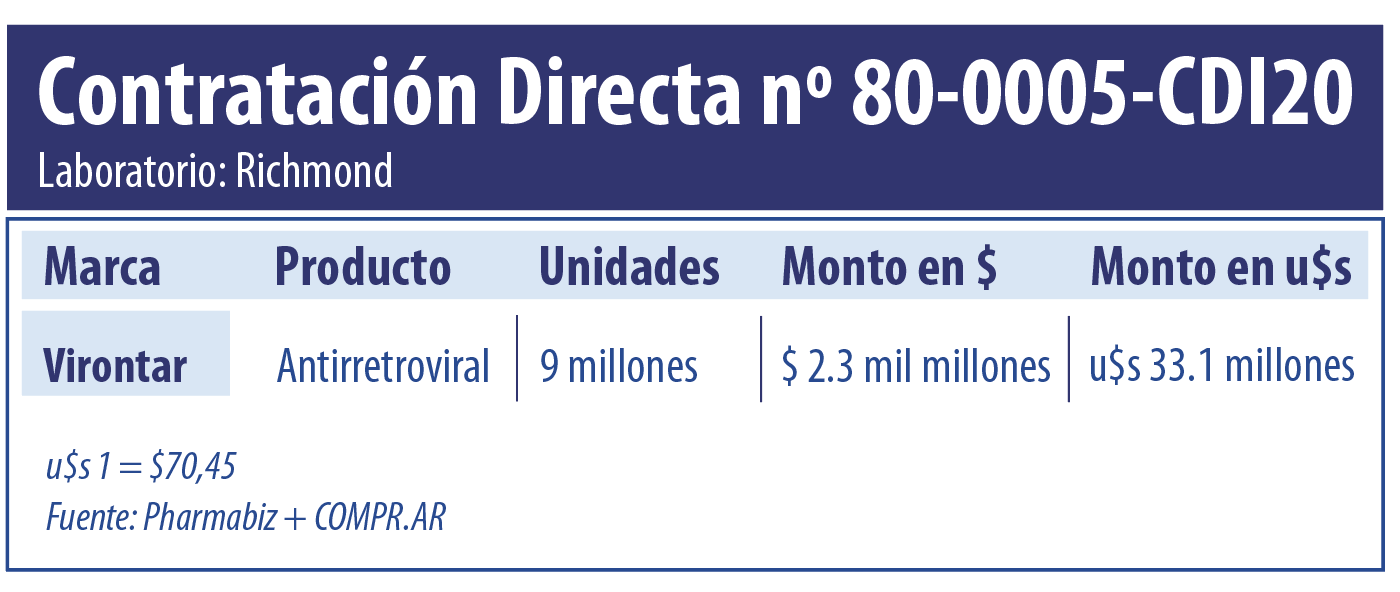 Por un lado, el Estado activó la compra de poco más de 9 millones de unidades del antirretroviral Virontar, que lleva el sello del nacional Richmond. El laboratorio que es el titular del único certificado registrado de la especialidad que combina darunavir y ritonavir, podría recibir un total equivalente a $2.333 millones (u$s 33.1 millones). Ver contratación Richmond.