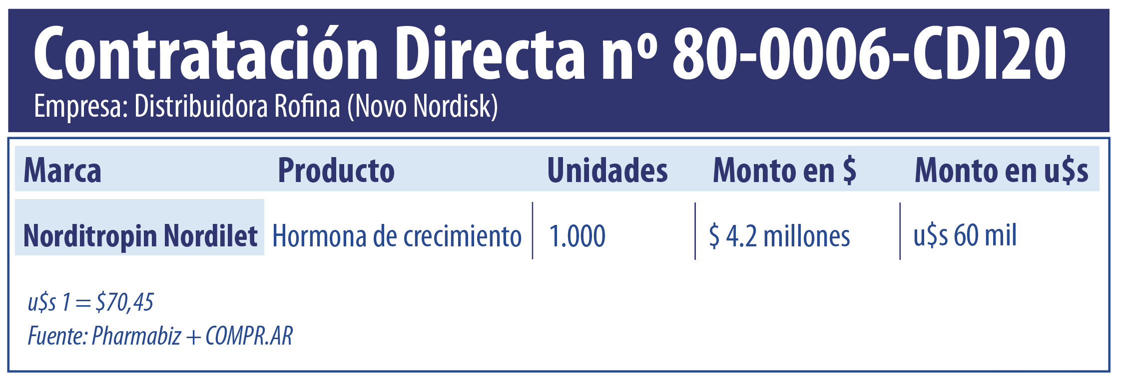 En simultáneo, la cartera que tiene como titular a Ginés González García puso en marcha un proceso para adquirir 1.000 cartuchos ampolla por 15 unidades internacionales (UI) de la hormona de crecimiento recombinante Norditropin Nordilet de la danesa Novo Nordisk. Novo se anotó a esta contratación por medio de la distribuidora Rofina y podría obtener ingresos por $4.2 millones (u$s 60.1 mil). Ver contratación Novo.
