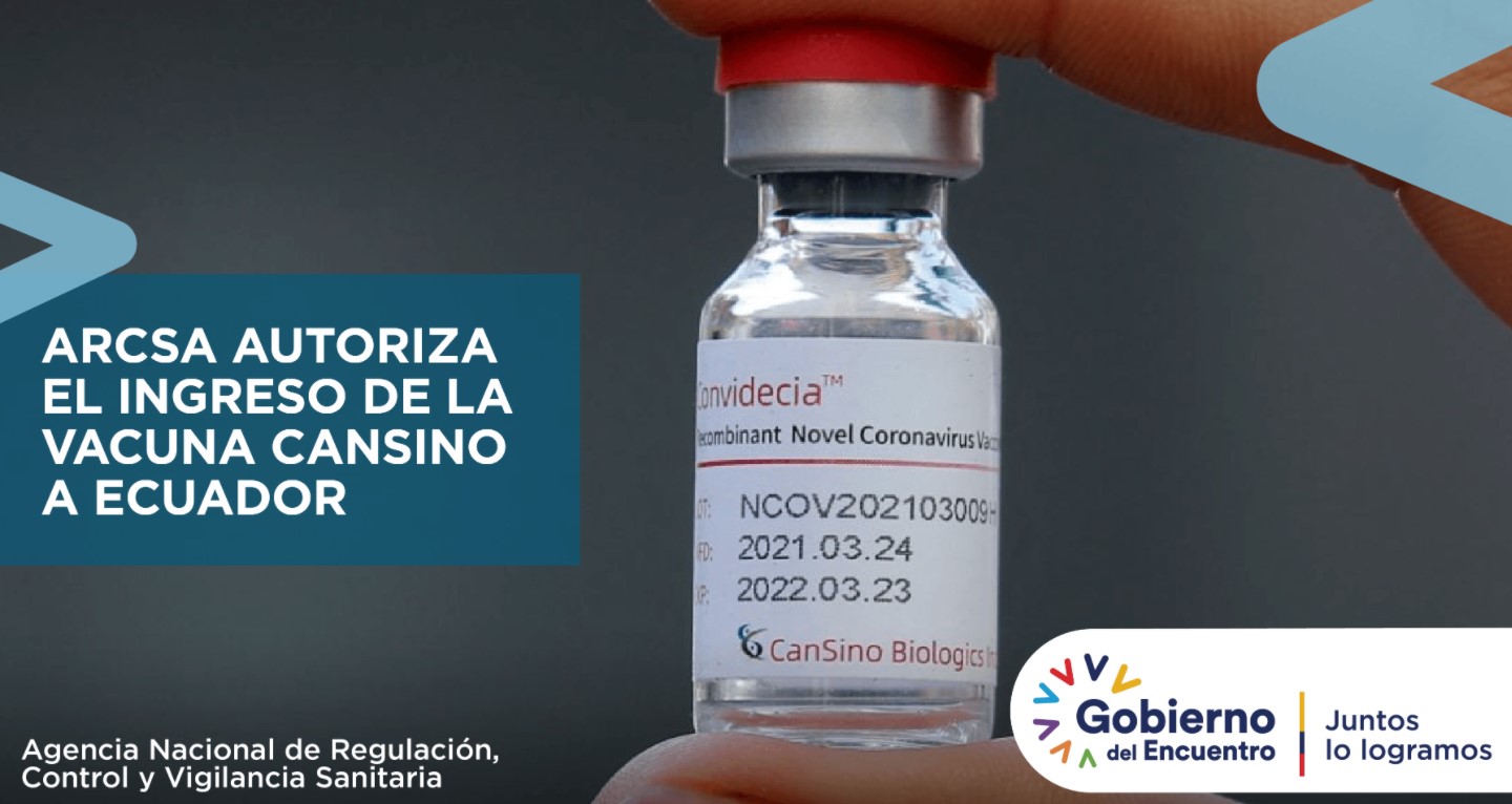La Agencia Nacional de Regulación, Control y Vigilancia Sanitaria -ARCSA-, emitió ayer martes 15 de junio, la autorización para importar la vacuna Convidecia desarrollada por la china CanSino. Ver comunicado.