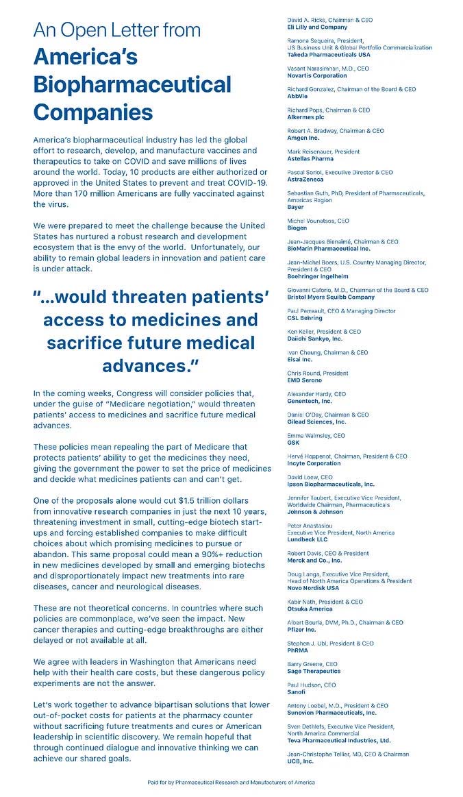 En una carta abierta al Congreso, los principales referentes del sector, consignaron que la propuesta «amenazaría el acceso de los pacientes a los medicamentos y sacrificaría los avances médicos futuros«. El documento llevó la firma, de los CEOs Richard Gonzalez de AbbVie; Giovanni Caforio de Bristol Myers Squibb; Michel Vounatsos de Biogen; Emma Walmsley de GlaxoSmithKline; Albert Bourla de Pfizer; y David Ricks de Eli Lilly, entre otros.