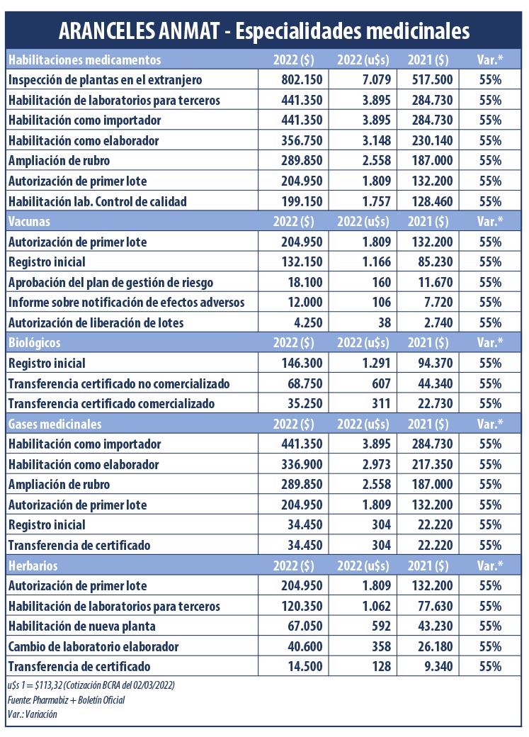Con cierta demora, se dieron a conocer esta semana, los nuevos montos que deben pagar los laboratorios y otras empresas del sector relativos a los trámites que se cumplimentan ante la ANMAT. Todos los precios aumentaron un 55% respecto del 2021, lo que de alguna manera, se pone en sintonía con la inflación oficial del año pasado que fue del 50.9%.