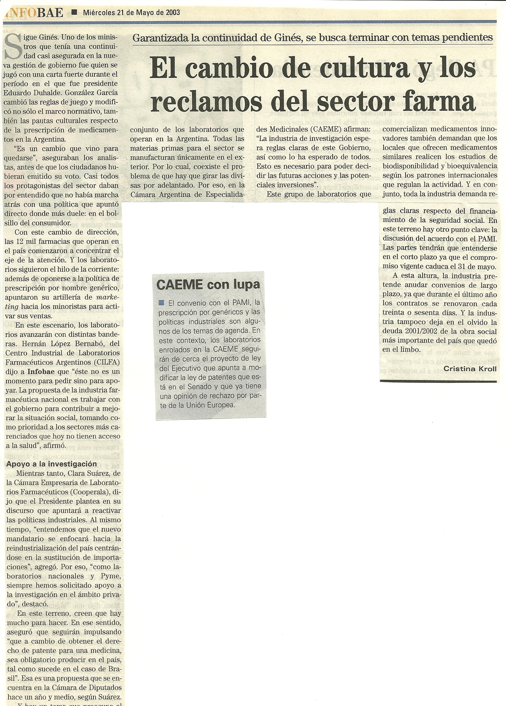 Sigue Ginés. Uno de los ministros que tenía una continuidad casi asegurada en la nueva gestión de gobierno fue quien se jugó con una carta fuerte durante el período en el que fue presidente Eduardo Duhalde. González García cambió las reglas del juego y modificó no sólo el marco normativo, también las pautas culturales respecto de la prescripción de medicamentos en la Argentina.