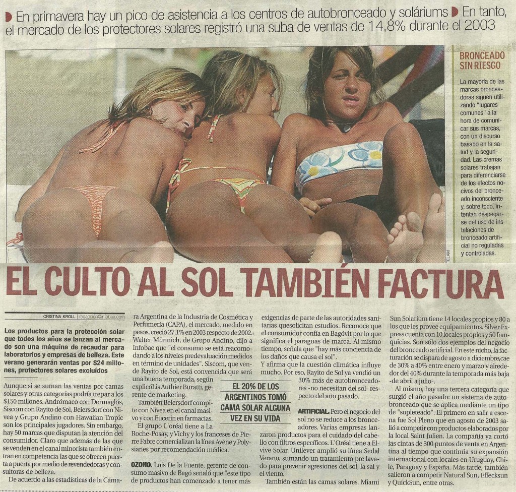 De acuerdo a las estadísticas de la Cámara Argentina de la Industria de Cosmética y Perfumería -CAPA-, el mercado, medido en pesos, creció 27,1% en 2003 respecto de 2002. Walter Munnich, de Grupo Andino, dijo a Infobae que “el consumo se está reacomodando a los niveles predevaluación medidos en término de unidades”. Siscom, que vende Rayito de Sol, está convencida que será una buena temporada, según explicó Lis Authier Buratti, gerente de marketing.