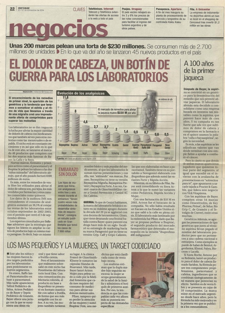 Los laboratorios no se dan tregua en la lucha por aliviar la mayor cantidad de dolores de cabeza con medicamentos que también sirven para otras molestias como las menstruales o de espalda. El nicho está en constante crecimiento y es así que sólo en lo que va de este año, se lanzaron al mercado 48 productos que compiten con las dos marcas mas famosas de Bayer: la Cafia y la Baya.