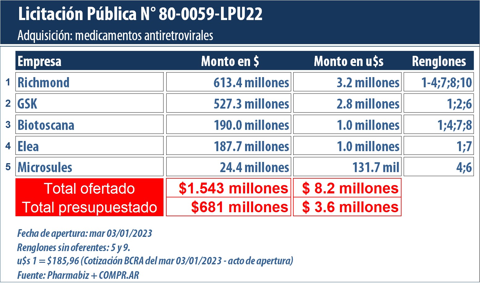 De acuerdo al desglose realizado por el equipo de analistas de Pharmabiz, a la licitación se inscribió un quinteto de empresas. El principal oferente fue el nacional Richmond. El laboratorio presidido por Marcelo Figueiras se registró a fin de cubrir siete renglones por un total de $613.4 millones (u$s 3.2 millones), con sus marcas Selmivir, Zevuvir ABC Pack, Zevuvir L Pack, Virorrever, Zetavudin, Lazinevir y Zetrotax. La última vez que la compañía proveyó al Estado de este tipo de medicamentos fue en diciembre del 2022, cuando facturó $2.646 millones (u$s 15.1 millones*). Ver artículo diciembre 2022.