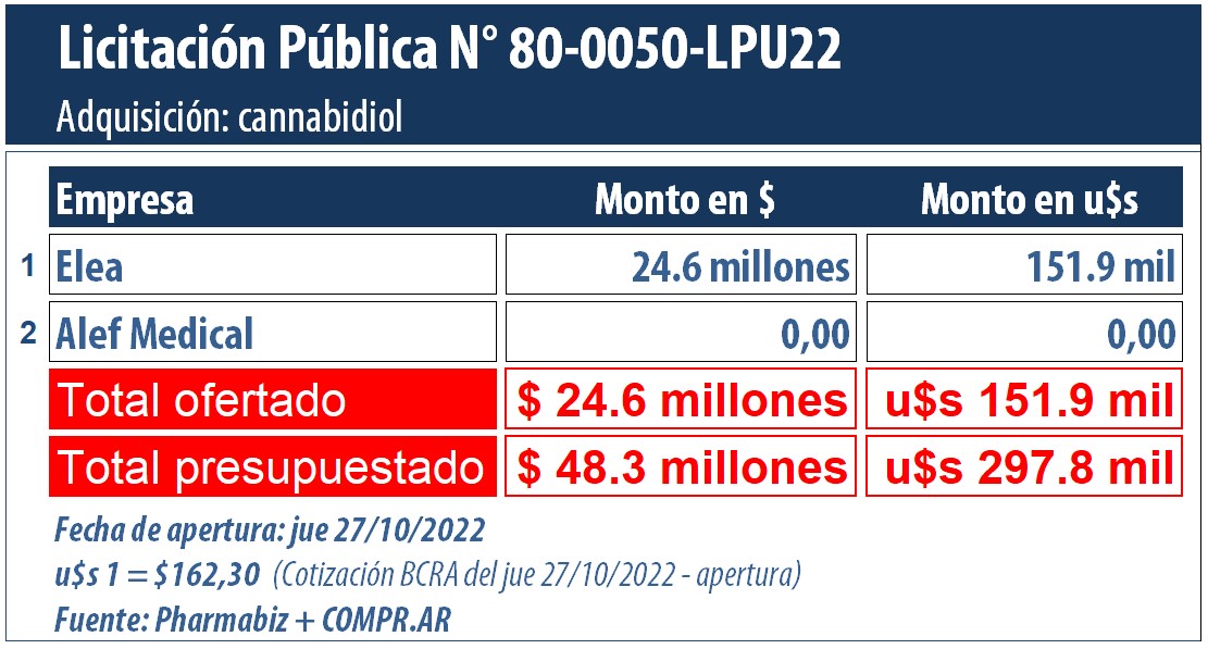 De modo que, el nacional Elea sería el único candidato a ganar esta licitación. El laboratorio se anotó a fin de cubrir la entrega de 3 mil frascos de Kanbis por un total de $24.6 millones (u$s 151.9 mil), lo que representa casi un 50% más bajo que el monto presupuestado desde el Estado. El producto que figura con un precio unitario de $8.2 mil (u$s 50,63) y que está bajo el escritorio de Isabel Carpintero, fue aprobado por la ANMAT a fines del 2021. Ver artículo