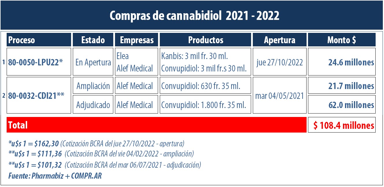 Un bienio después de haberse aprobado el primer producto a base de cannabidiol, y a un año de efectuada la primera compra pública de anticonvulsivantes de este tipo, el Estado abrió el segundo proceso. Las que se anotaron en la compulsa fueron Alef Medical Argentina y el nacional Elea.