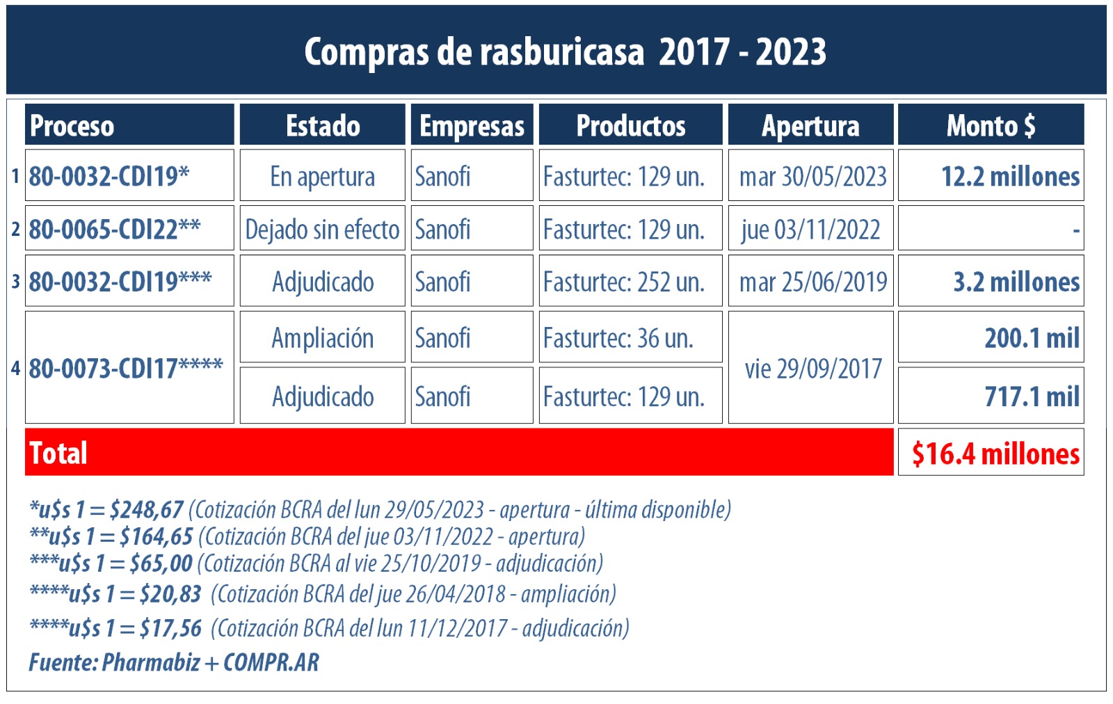 En noviembre del 2022 quedó sin efecto un proceso de compra por el cual Sanofi se había presentado. La decisión corrió por cuenta de la Dirección Nacional de Medicamentos y Tecnología Sanitaria debido a que el importe cotizado por la francesa era superior al valor referencial estimado por la cartera pública y que la multi no respondió al pedido de mejora de precio. Ver artículo apertura.