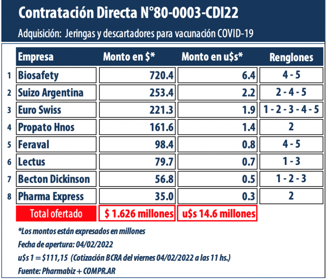 Por último, la norteamericana Becton Dickinson se presentó de manera parcial con sus jeringas BD Flu+; y BD Plastipak por $56.8 millones (u$s 500 mil). Y la firma Pharma Express hizo lo propio con la marca I.CO por $35 millones (u$s 300 mil).