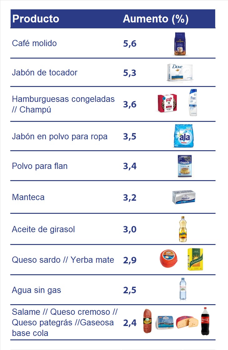 En la canasta general, en tanto, los productos que más aumentaron, además de los mencionados, son el jabón en polvo para la ropa, con un 3,5% de suba y el polvo para flan que se incrementó un 3,4%.