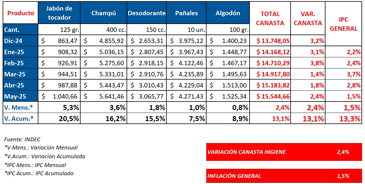 En mayo los cinco productos tuvieron un valor de $15.544,66 (u$s 12,92). Mientras tanto, en abril adquirir esta canasta de higiene configurada por el INDEC representó un gasto de $15.183,82 (u$s 13,1). Así, en dólares el precio de los productos prácticamente no se modificó.